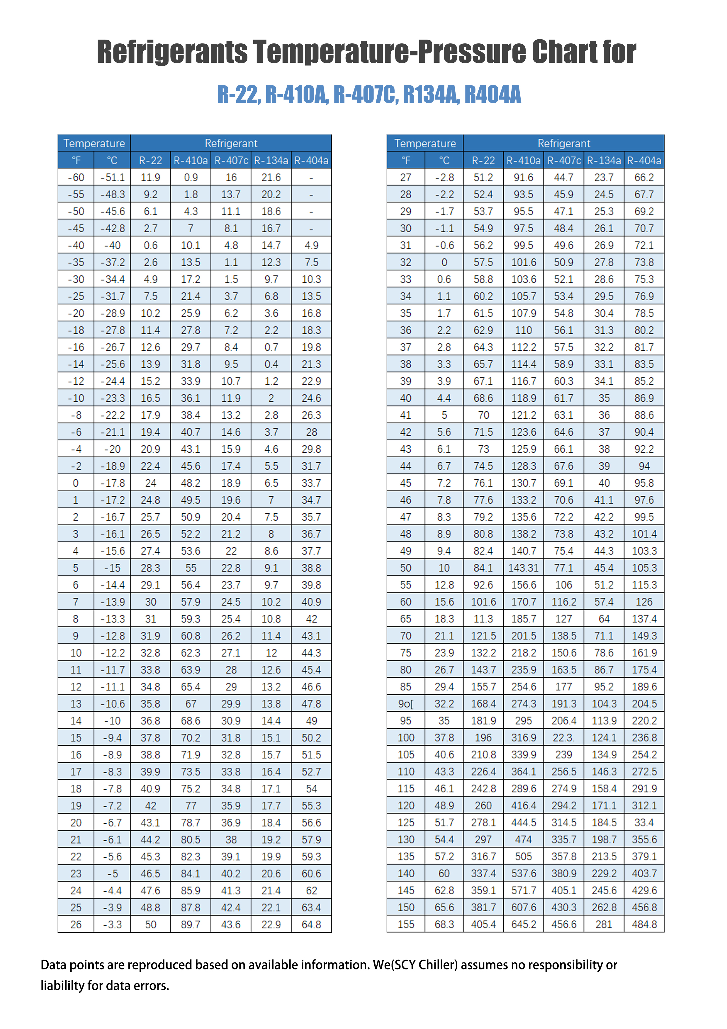 | ° F | ° C | R-22 | R-410a | R-407c | R-134a | R-404a |